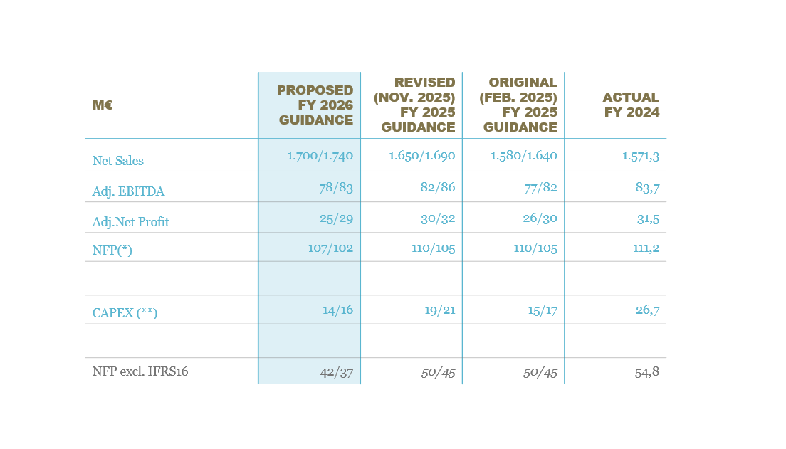 * The reported NFP considers the renewal of the charter contract for the fifth ship operated by the Shipping Bu on a three-year basis (2026-2028 period), instead of two-year period as was the case until 2025, with an incremental effect on lease liabilities equal to approximately one year’s charter (€5.5 million). For the sole purpose of the 2026 Guidance, it has been assumed a cash dividend payout. It does not include the execution of the buyback program.